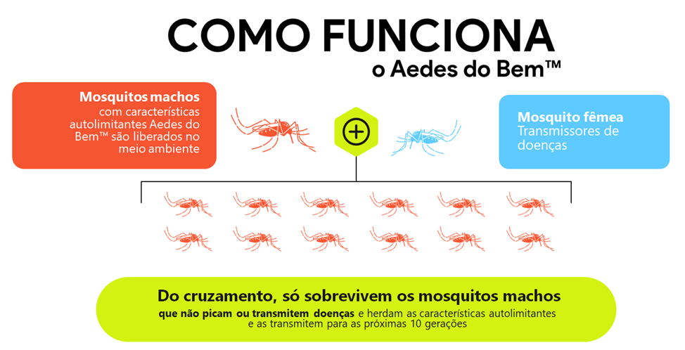 O Aedes do Bem™ é a solução biológica, segura e inovadora que atua de forma preventiva no controle do mosquito, realizando um processo de controle de natalidade, não deixando ocorrer o desenvolvimento do mosquito fêmea, que é a responsável pela transmissão de Doenças como a dengue, zika, chikungunya e febre amarela.